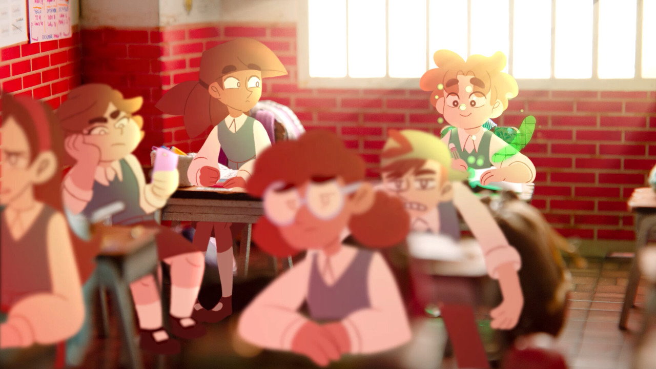 A diligent student struggles to concentrate in class, but her classmate, lost in his thoughts, creates fantastical beings that draw her into his world. In an attempt to stop him from distracting her, she creates her own fantasy.