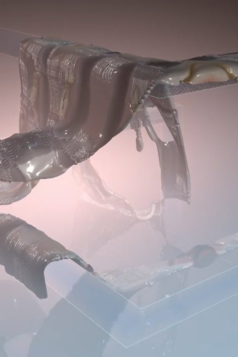 Aliquid is a single channel video where the electronic signal is manipulated digitally to materialize into synthetic flesh. Slowly landing onto a glass architecture, this undefined substance is torn apart by sharp edges and eventually disintegrates into particules that spread into the atmosphere.